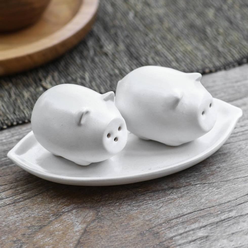 Matte White Ceramic Pig Salt and Pepper Shakers with Tray 'Portly Pigs in White' Item ID: 2671745606