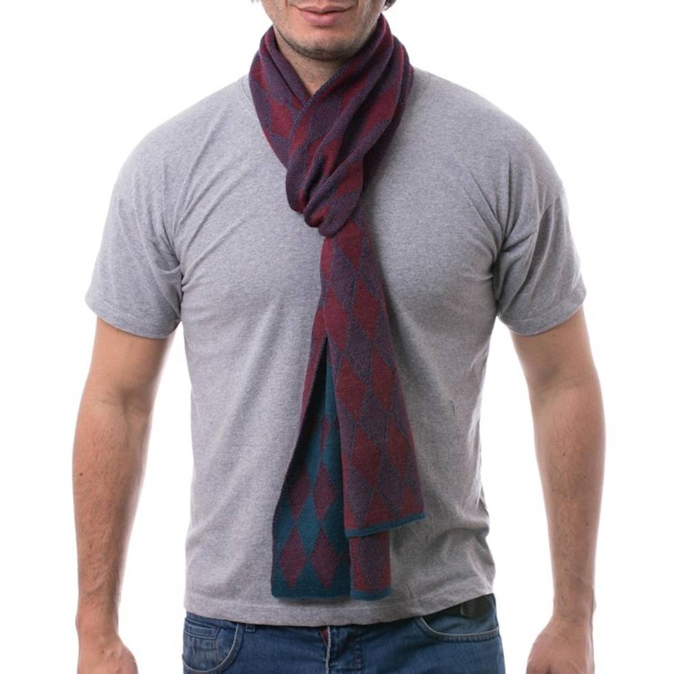 Men's Alpaca Blend Scarf in Teal and Cherry from Peru 'Diamond Sophistication' Item ID: 2669891449