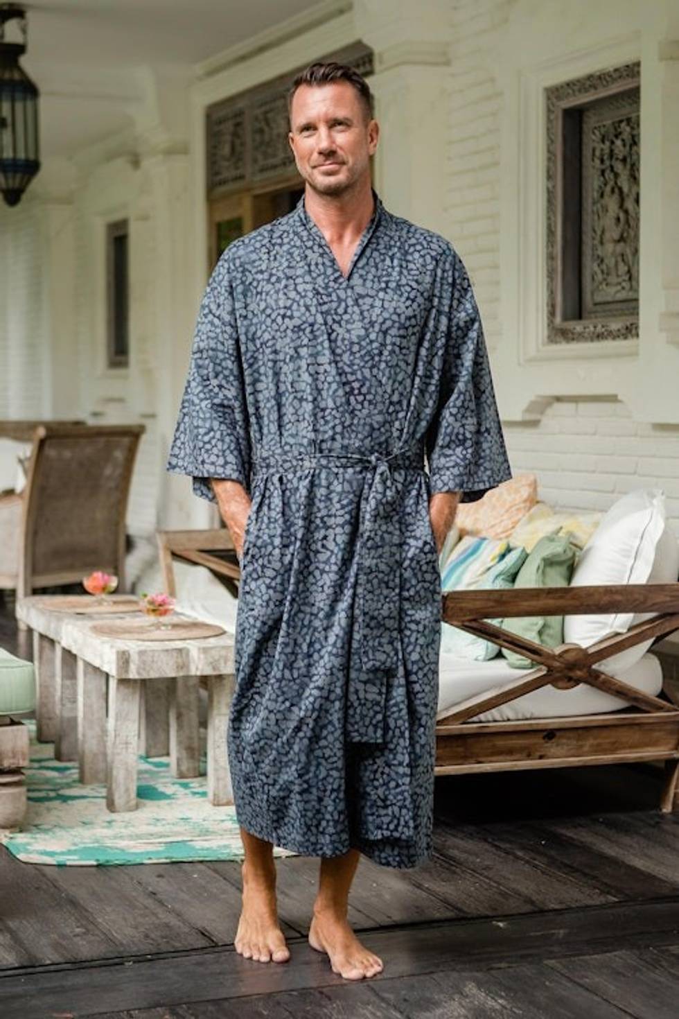 I bought this robe as a present for my friend to use when sleeping over at my house and he loves it so much he took it home! It is made of the softest, most flowy batik I've seen so far and is incredibly comfortable and pleasant to wear and move around in.