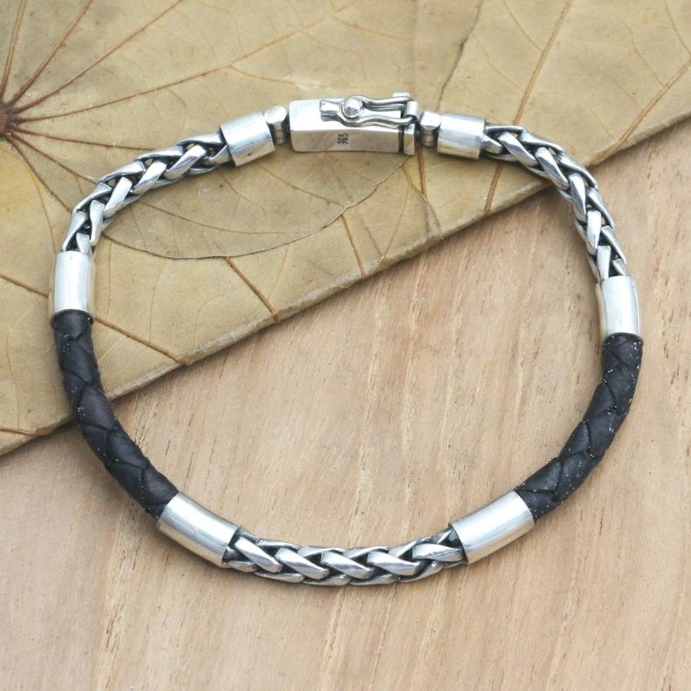 Men's Black Leather and Sterling Silver Bracelet 'Charming Man in Black' Item ID: 2669922965