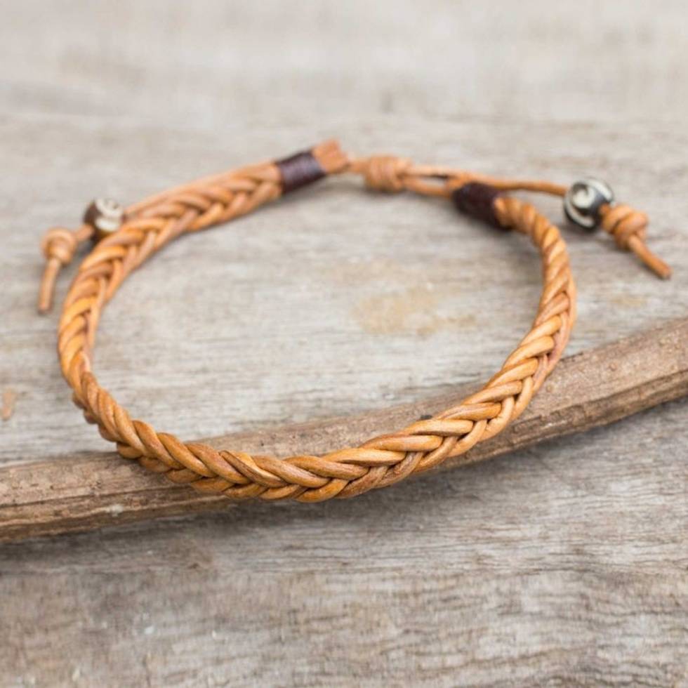 Men's Braided Light Brown Leather Bracelet from Thailand 'Friends and Brothers' Item ID: 2671801974