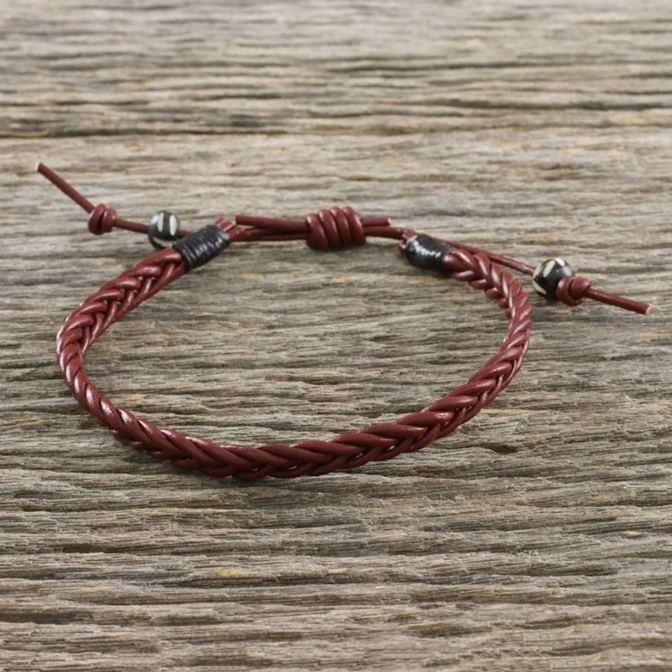 Men's Cow Bone Bead Mahogany Braided Leather Bracelet 'Rustic Simplicity' Item ID: 2671801011