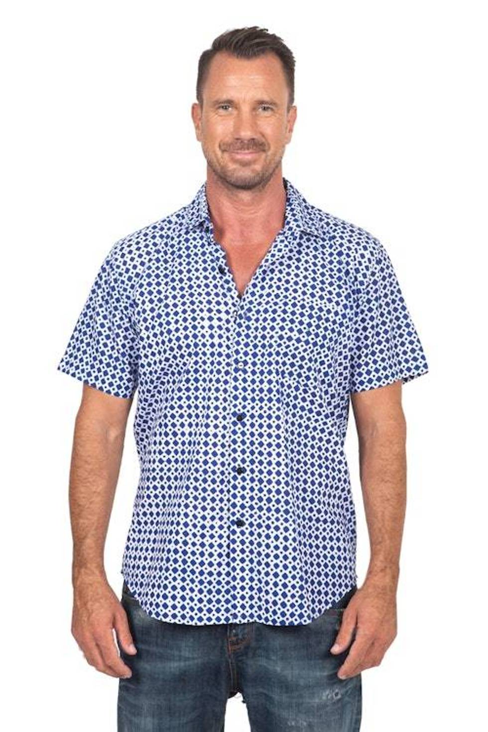 Men's Hand-Stamped Blue and White Cotton Shirt 'Blue Kites' Item ID: 2676667802