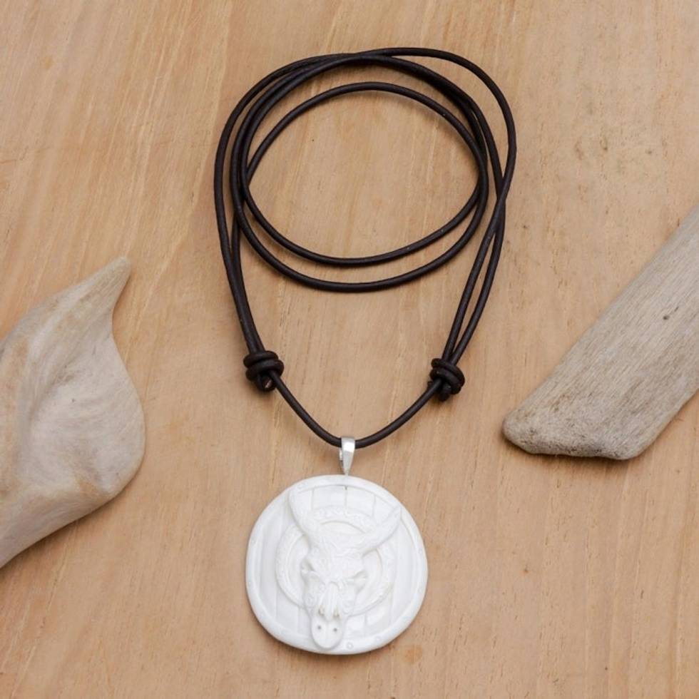 Men's Handcrafted Bone Pendant Necklace with Leather Cord 'Ferocious Bull' Item ID: 2671763287