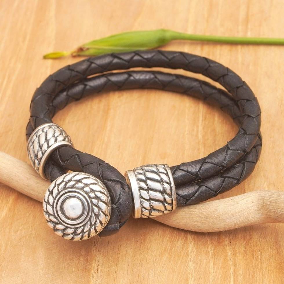 Men's Leather Braided Strand Bracelet with 925 Silver Accent 'Balinese Reign' Item ID: 2671764634