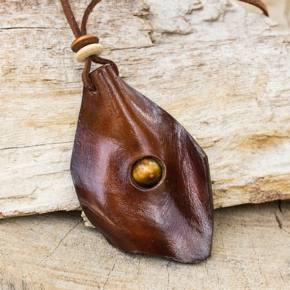 Men's Leather Wood and Tiger's Eye Pendant Necklace 'Thai Cowboy' Item ID: 2671641481