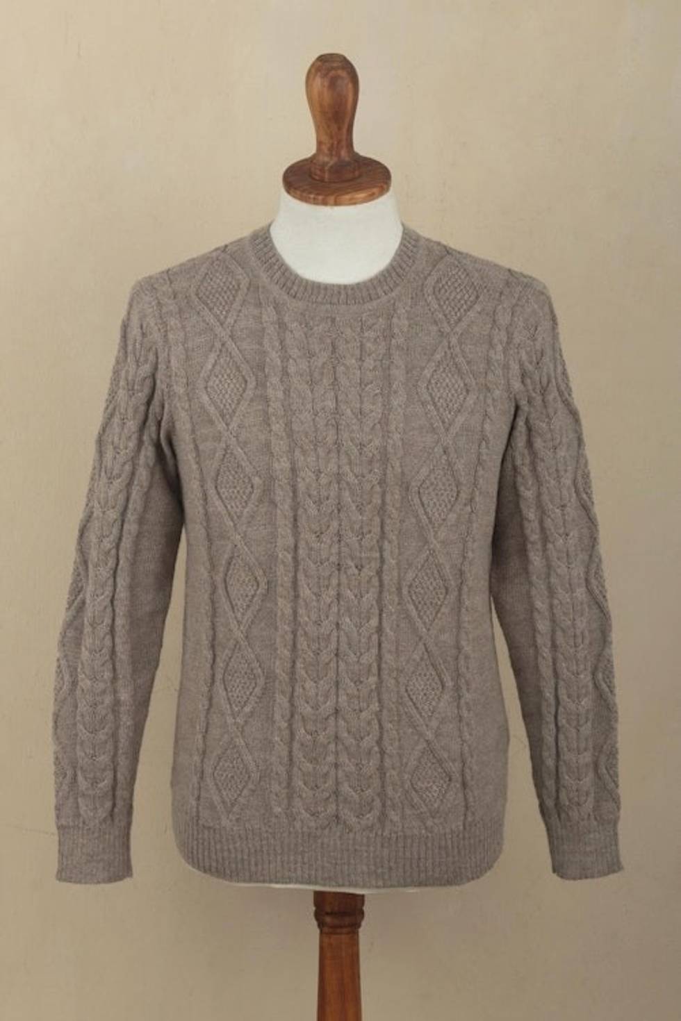 Men's Mushroom Brown 100 Alpaca Cable Knit Pullover Sweater 'Mushroom Brown Geometry' Item ID: 2671667631