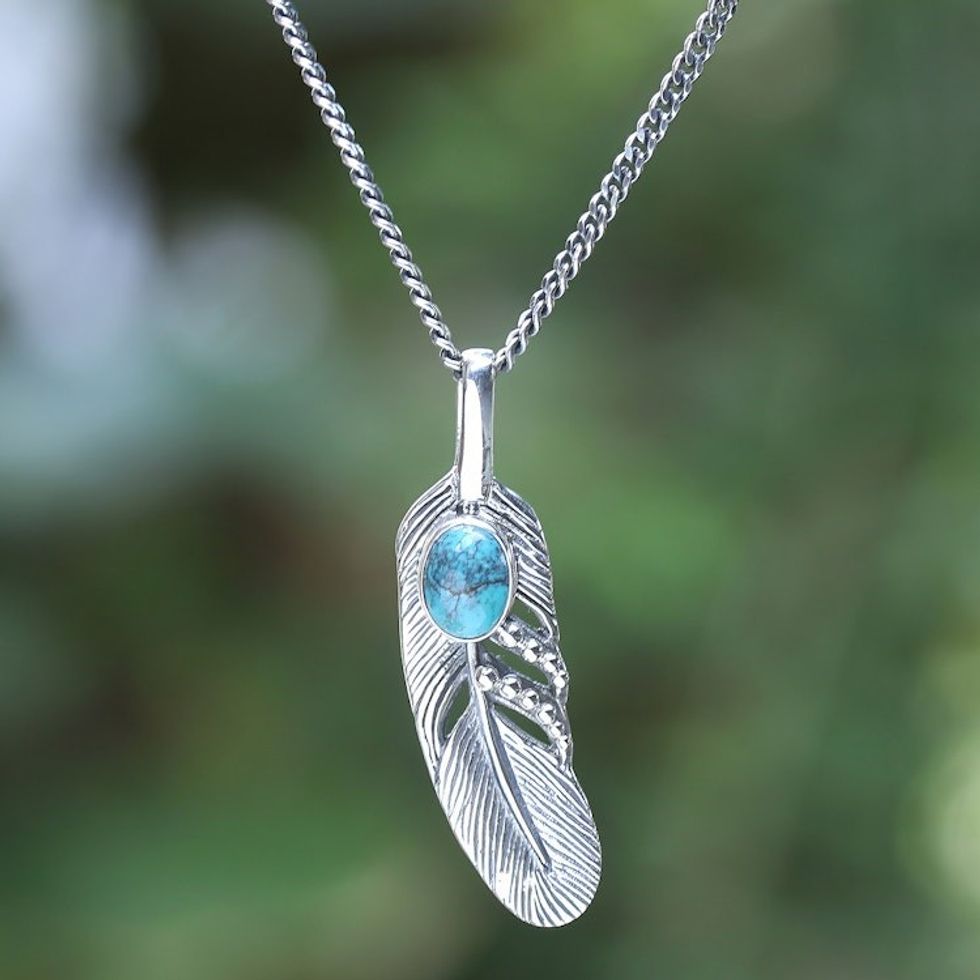 Men's Reconstituted Turquoise Feather Pendant Necklace 'Bright Feather' Item ID: 2671765683