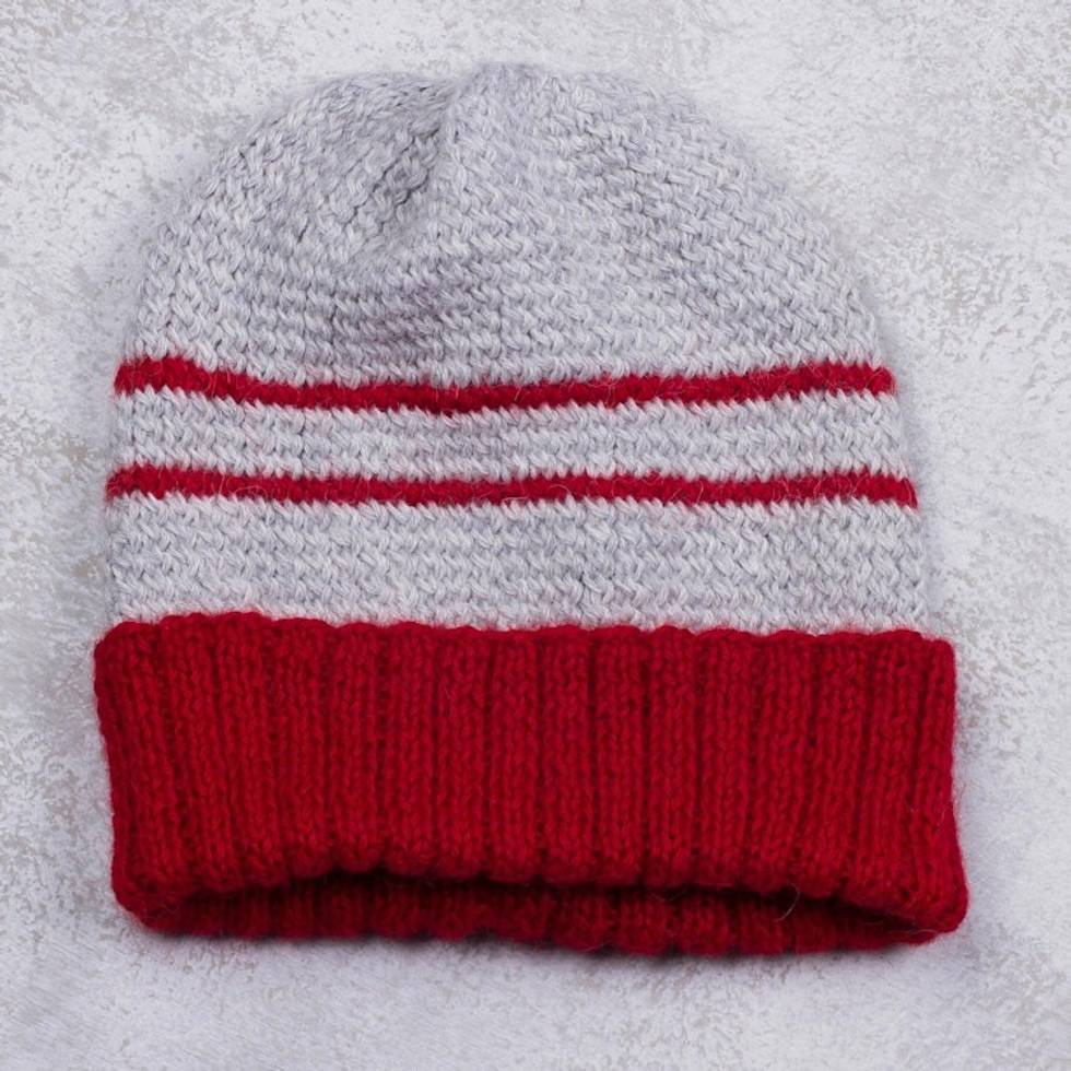 Men's Red and Grey Striped Alpaca Blend Hat from Peru 'Winter's Embrace in Red' Item ID: 2669907628