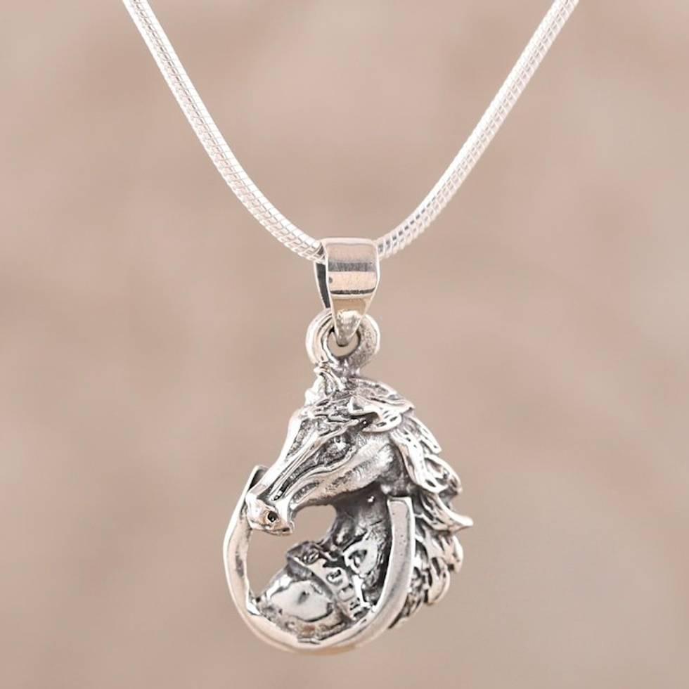 Men's Sterling Silver Horse Pendant Necklace from India 'Lucky Horse' Item ID: 2671792086