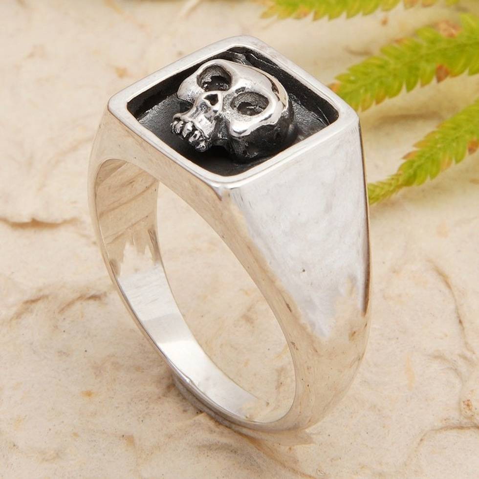 Men's Sterling Silver Signet Ring with Skull Motif from Bali 'Father Skull' Item ID: 2671667531