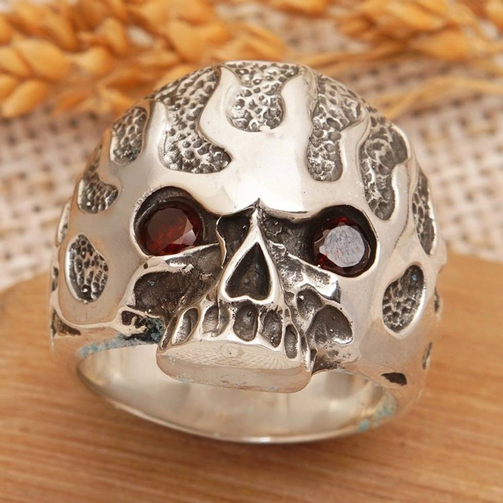 Men's Sterling Silver Skull Cocktail Ring with Garnet Stones 'Fire Skull' Item ID: 2671764888