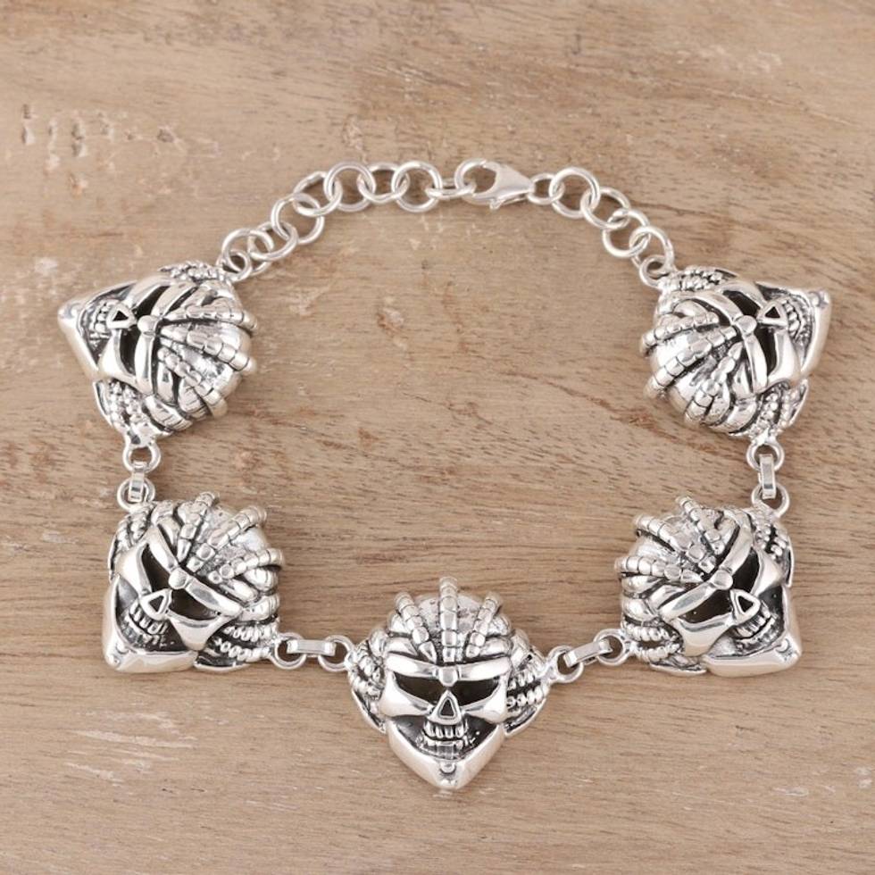 Men's Sterling Silver Skull Link Bracelet Crafted in India 'Skull Grin' Item ID: 2671792992