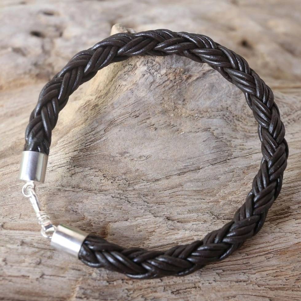 Men's Thai Brown Leather Braided Bracelet with Silver Clasp 'Sophisticated Braid' Item ID: 2671640991