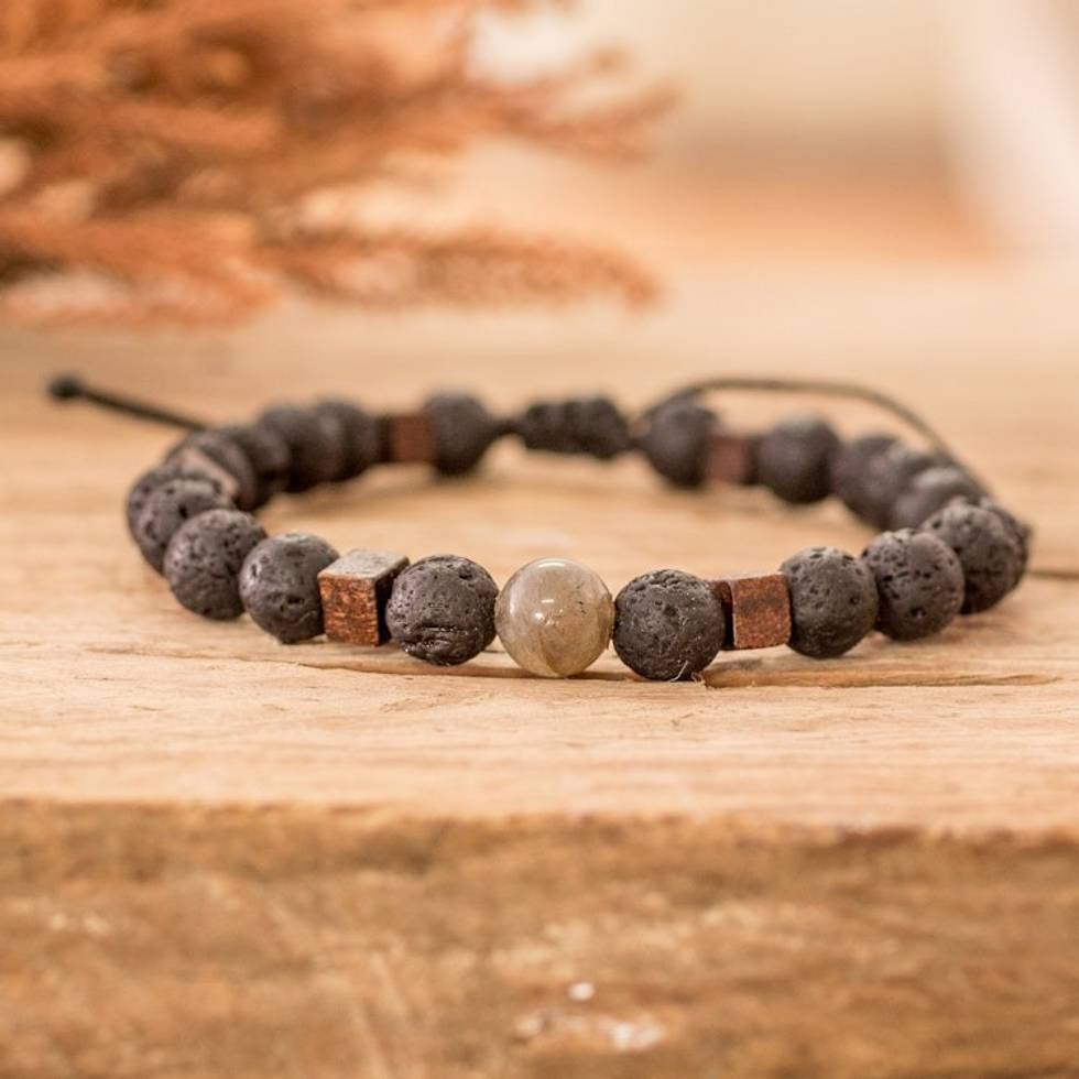 Men's Volcanic Stone Beaded Bracelet with Labradorite Jewel 'Inner Hero' Item ID: 2669934121