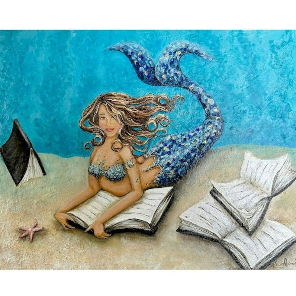 This captivating mixed-media painting is of a young mermaid reading a book that has fallen from a ship. She's sitting on the bottom of a sandy ocean floor in the turquoise sea. She's a little bookworm who loves getting lost in a fairytale. The art piece has been done on deep canvas. It is ready to hang