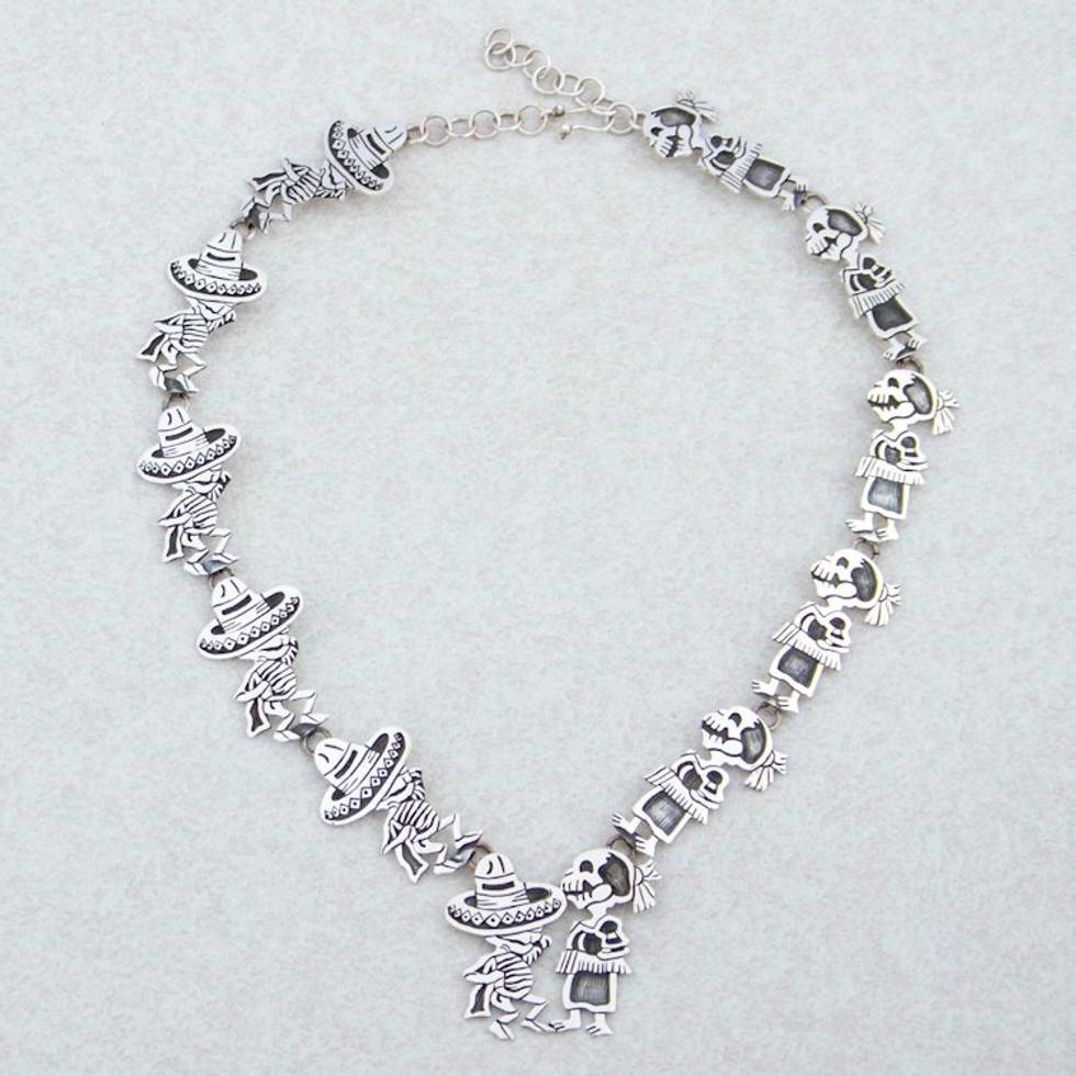 Mexican Day of the Dead Sterling Silver Link Necklace 'Skeletal Hat Dance' Item ID: 2671808956