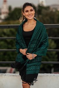 Mexican Handwoven Zapotec Shawl Cotton in Black and Aqua 'Agave Shadows' Item ID: 2669897760