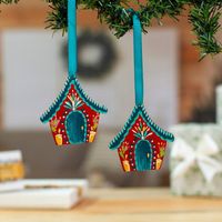 Mexican-Made Hand-Painted Teal and Red Wood Ornament Pair 'Enchanted Home' Item ID: 2671798793