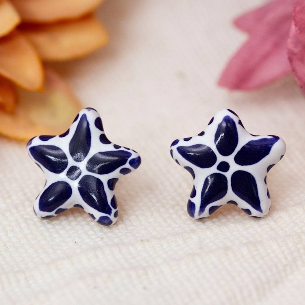 Mexican-Made Talavera-Inspired Star Ceramic Button Earrings 'Talavera Constellation' Item ID: 2671639175