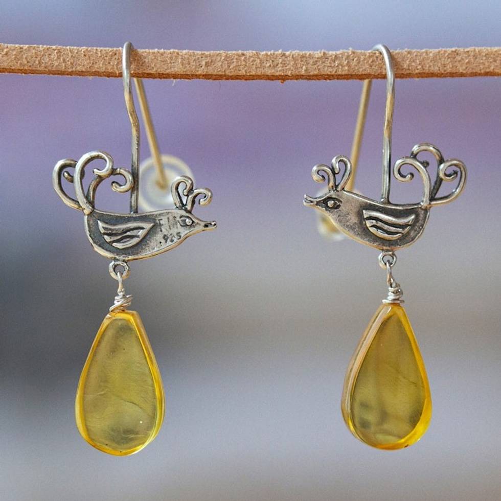 Mexican Sterling Silver Bird Earrings with Amber Droplets 'Flirty Birds' Item ID: 2671639284