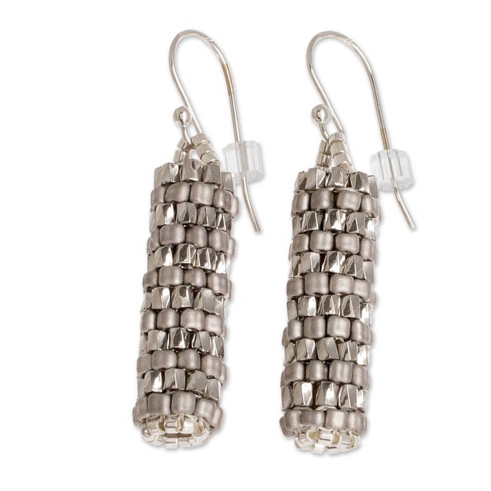 Miyuki Glass Bead Basket Like Dangle Earrings in Silver Tone 'Silvery Pillars' Item ID: 2671771659