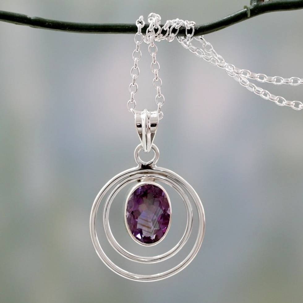 Modern Artisan Crafted Silver and Amethyst Pendant Necklace 'Twin Halo' Item ID: 2669943774