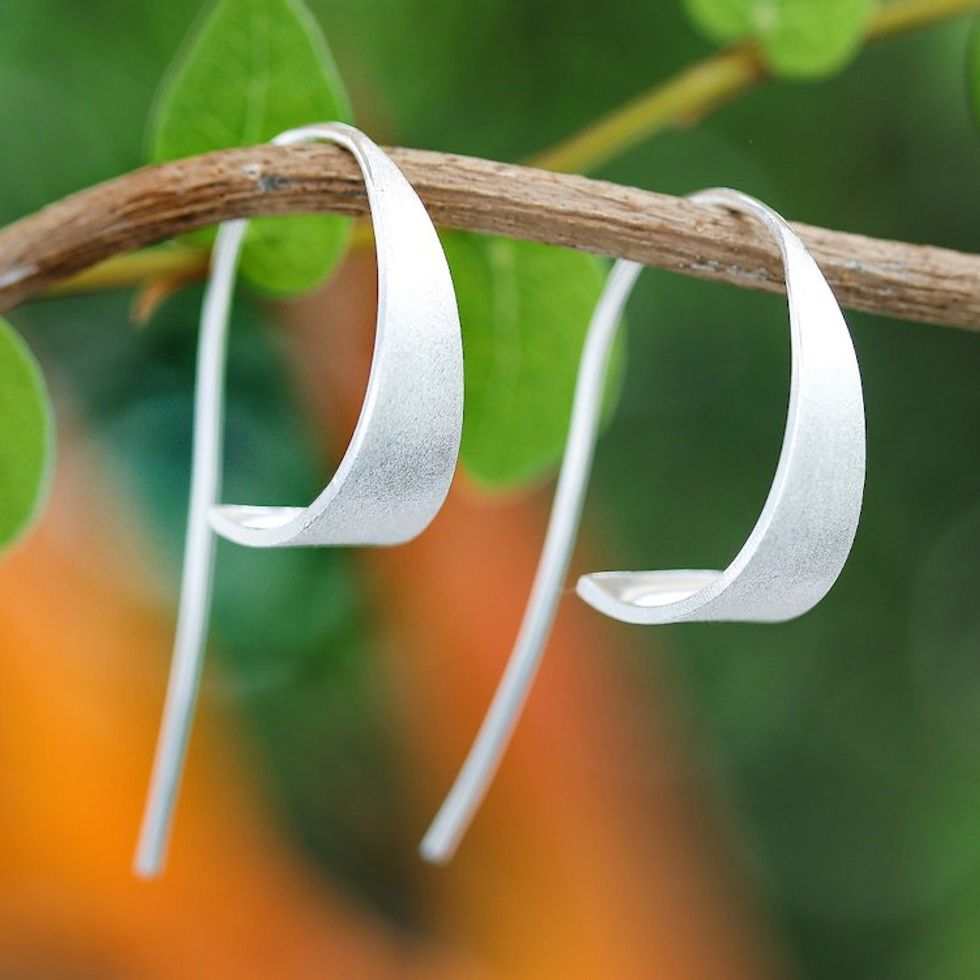 Modern Brushed Satin Sterling Silver Curved Drop Earrings 'Curved Triangle' Item ID: 2671796660