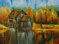 Modern Cubism Watermill Landscape Acrylic Painting 'Fragments II' Item ID: 2669898924