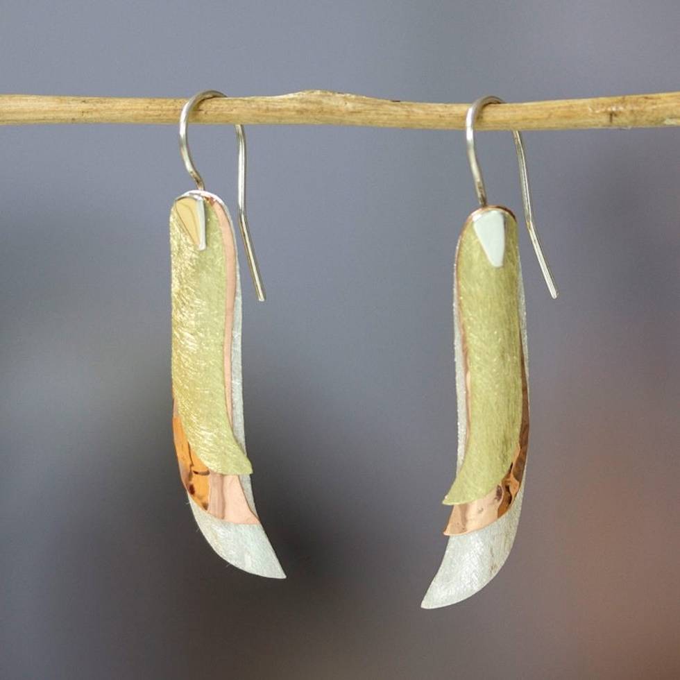 'Between Layers', sterling silver & copper dangle earrings are unique, look interesting, beautiful when worn. Will look terrific worn alone or can try with Guillermo Arregui's 'Taxco Mix' collar and bracelet and ring that stacks ( 2 silver with 1 copper). Well crafted. Good value. Eye-catching. Happy with purchase.