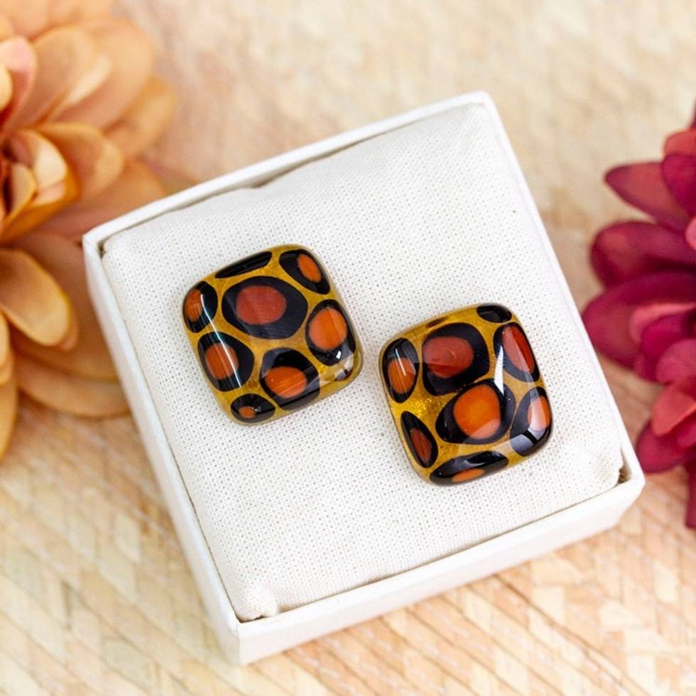Modern Fused Art Glass Animal Print Square Button Earrings 'Exotic Animal Print Square' Item ID: 2671798550