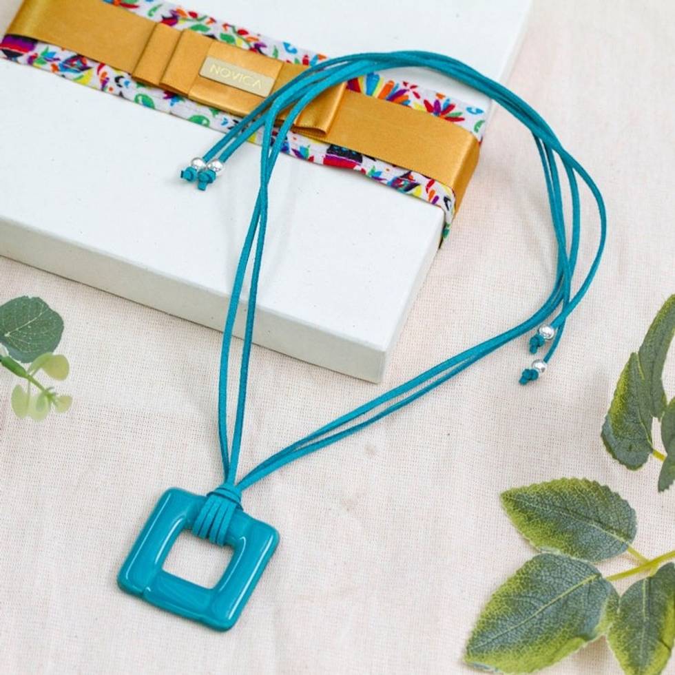 Modern Fused Art Glass Square Pendant Necklace in Teal Shade 'Teal Square' Item ID: 2671798566