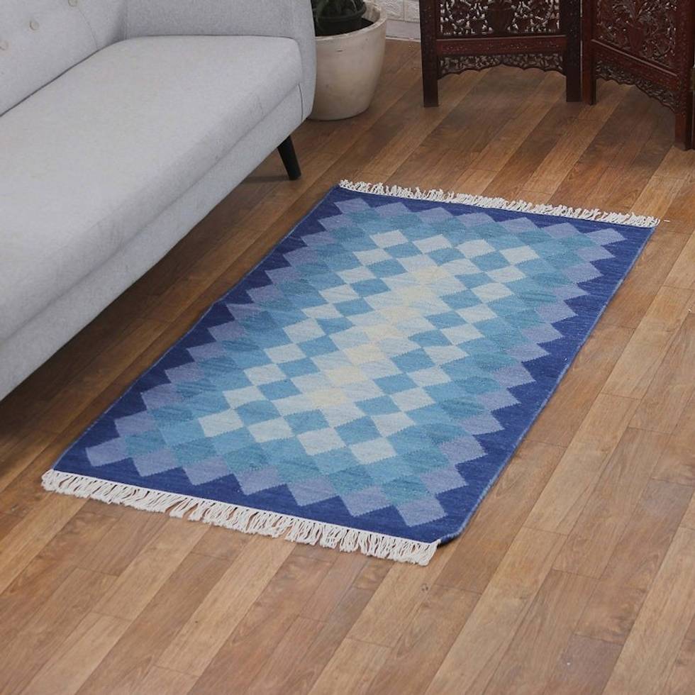 "Transform your interiors into a modern and sophisticated space with this elegant creation by Ashfaq Ahmed. Crafted on a traditional handloom, this area wool rug-directly from India-combines blue hues in a trendy geometric pattern, accented with fringes on each end for a graceful look."