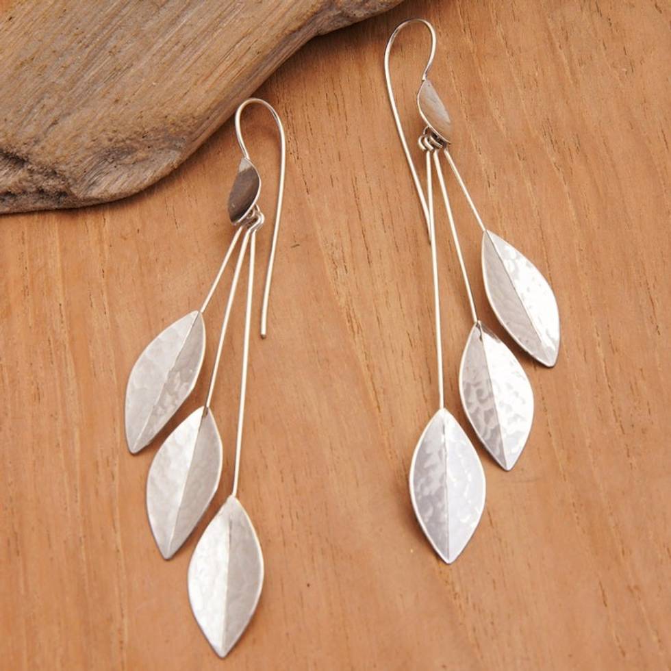 Modern Hammered Sterling Silver Leaf Dangle Earrings 'Winter Glisten' Item ID: 2671764744