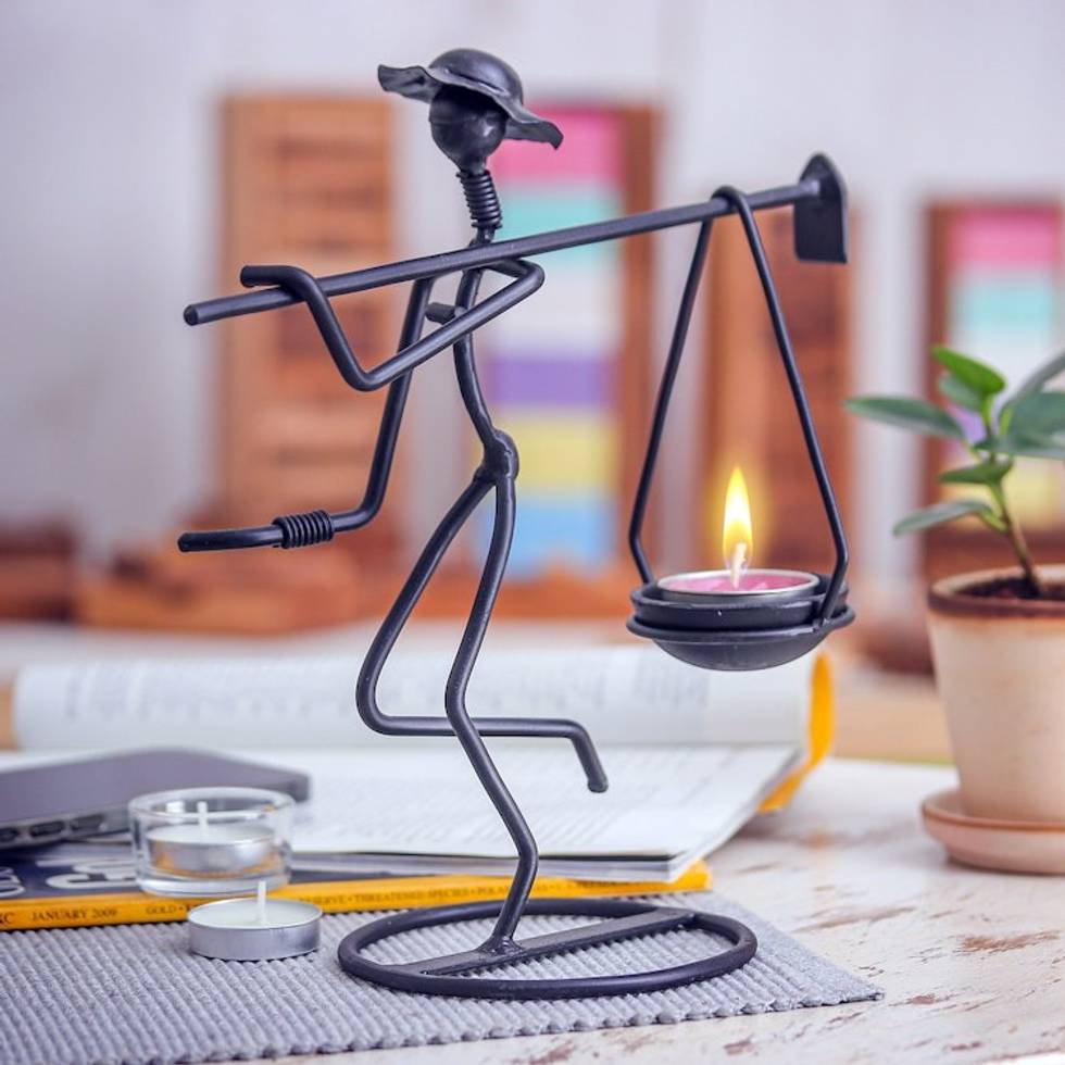 Modern Iron Tealight Holder of Man Carrying Weight in Black 'On my Way' Item ID: 2671796752