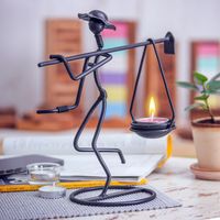 "Embrace the exquisite charm of this contemporary tealight holder, a masterpiece in minimalist design from Thai artisan Narakorn Wongnitkorn. Expertly handcrafted from iron, this unique accessory takes the form of an abstract man walking while carrying weight, adding a touch of artistic flair to your favorite space. Its sleek black silhouette effortlessly complements any decor while the flickering glow of the single tealight creates a cozy ambiance that invites relaxation and tranquility. Transform your cherished nook into a sanctuary of comfort and sophistication with this remarkable piece."