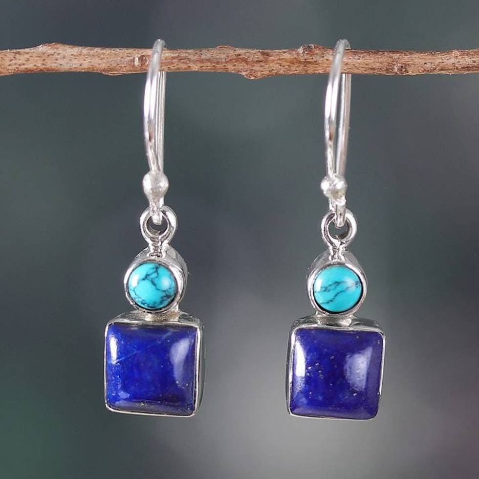 Modern Lapis Lazuli Calcite Sterling Silver Dangle Earrings 'Royal Fusion' Item ID: 2676664265