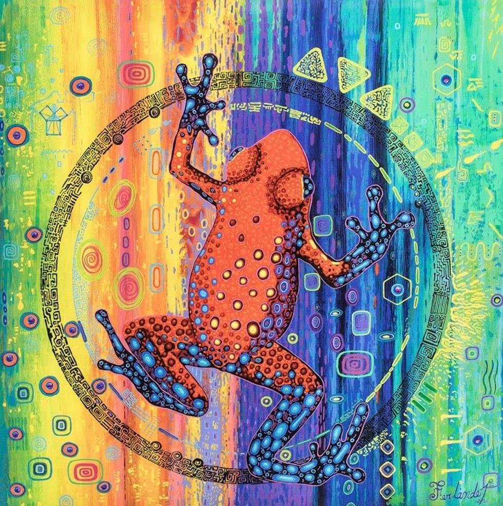 "As beautiful as it is deadly, the strawberry poison-dart frog found in Central America can even kill a human being with its venom. So it's best to enjoy its delicate features in the form of a multicolored wall decorative accent crafted in modern style by Costa Rica's Ferlander Arguedas. He first paints the exquisite composition with varied techniques and materials and then reproduces it with the sublimation technique on a stretched canvas."