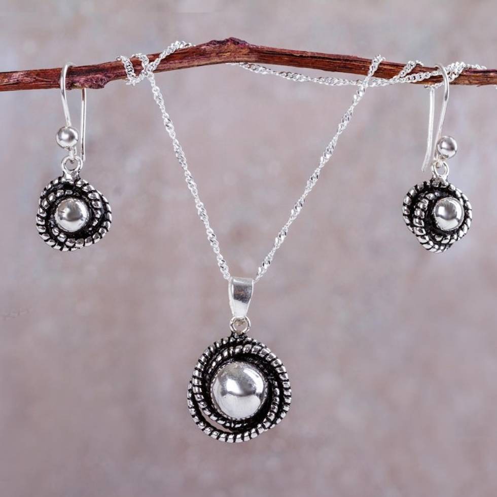 Modern Necklace and Earrings Set Crafted of Andean Silver 'Hummingbird Nest' Item ID: 2671819319