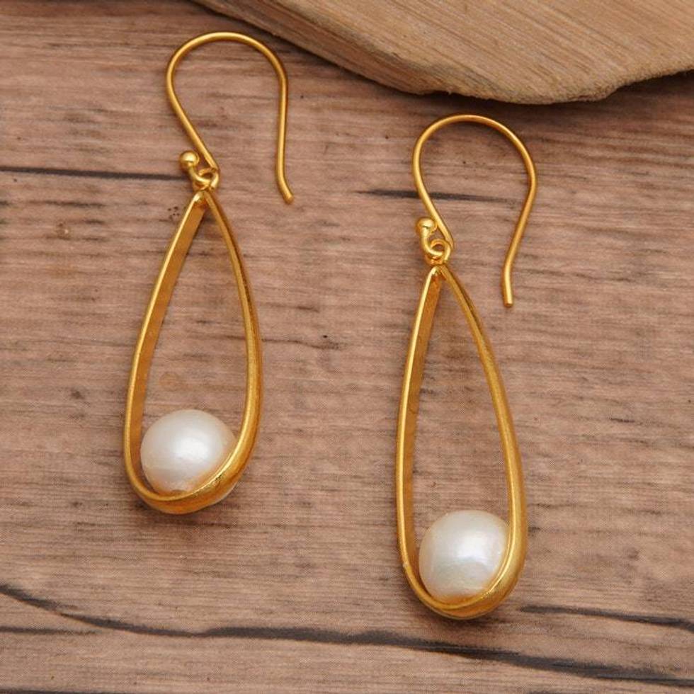 Modern Oval Gold-Plated Brass Cultured Pearl Dangle Earrings 'Trendy Flair' Item ID: 2676660842