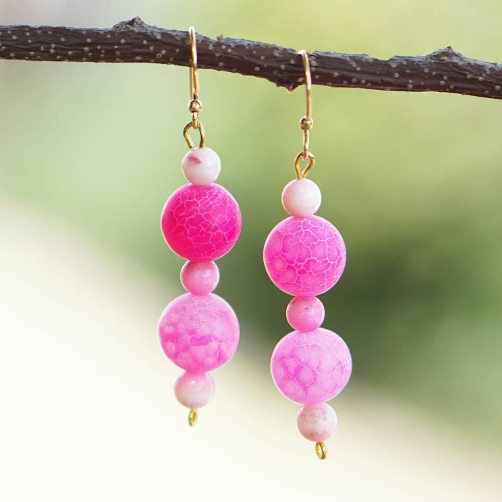 Modern Pink Agate Beaded Dangle Earrings with Brass Hooks 'Pink Universe' Item ID: 2671805356