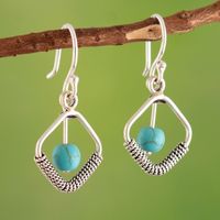 "Sleek and contemporary, this stylish design by Peru's Nancy Quispe boasts an exquisite geometric shape, unique textured accents as well as breathtaking reconstituted turquoise beads attached to polished sterling silver bars. The fabulous dangle earrings are sure to turn heads and make any outfit stand out."