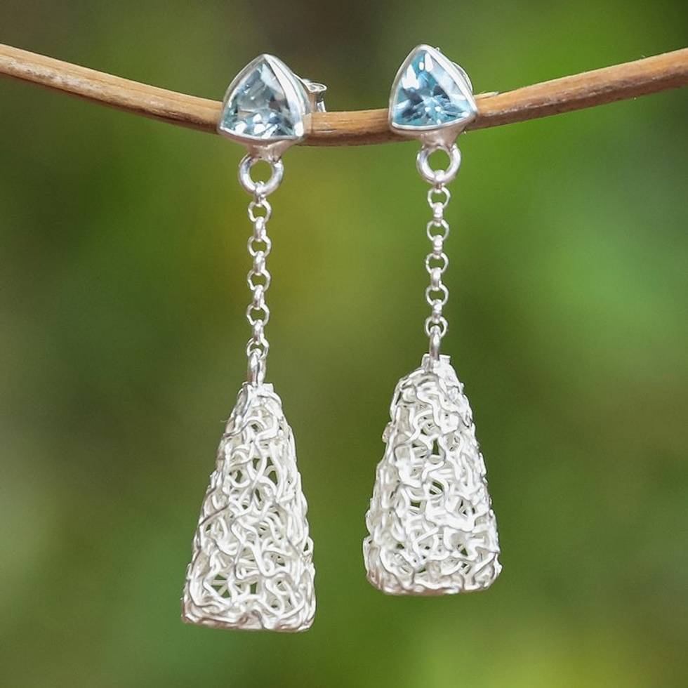 Modern Sterling Silver Dangle Earrings with Blue Topaz Gems 'Nest of Loyalty' Item ID: 2671764878