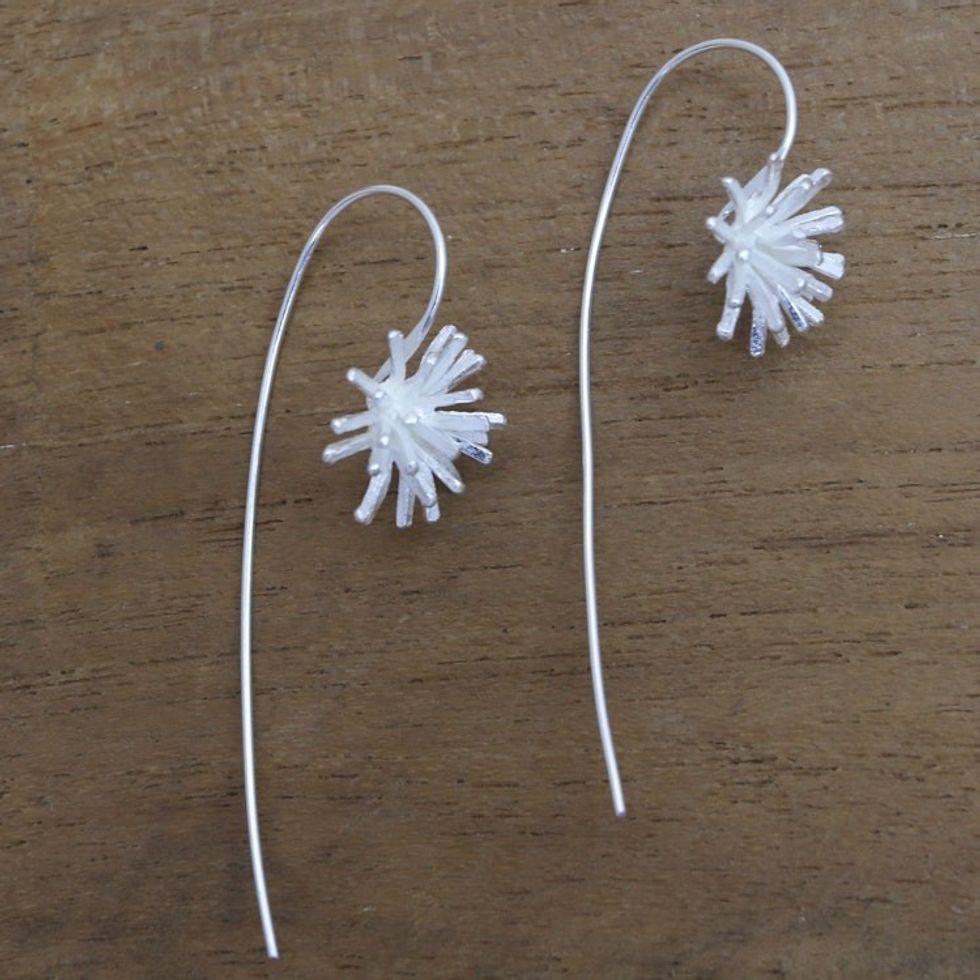 These earrings are beautifully simple. Soldered to a little silver hook is a sterling silver flower. The flower is dainty and three dimensional. These earrings go beautifully with the jasmine shimmer and silver breeze necklaces I have purchased from this artist previously. Thank you for sharing your talent with me!