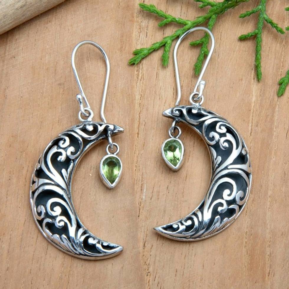 Moon-Shaped Leafy Dangle Earrings with Peridot Jewels 'Fortune Night' Item ID: 2671671274