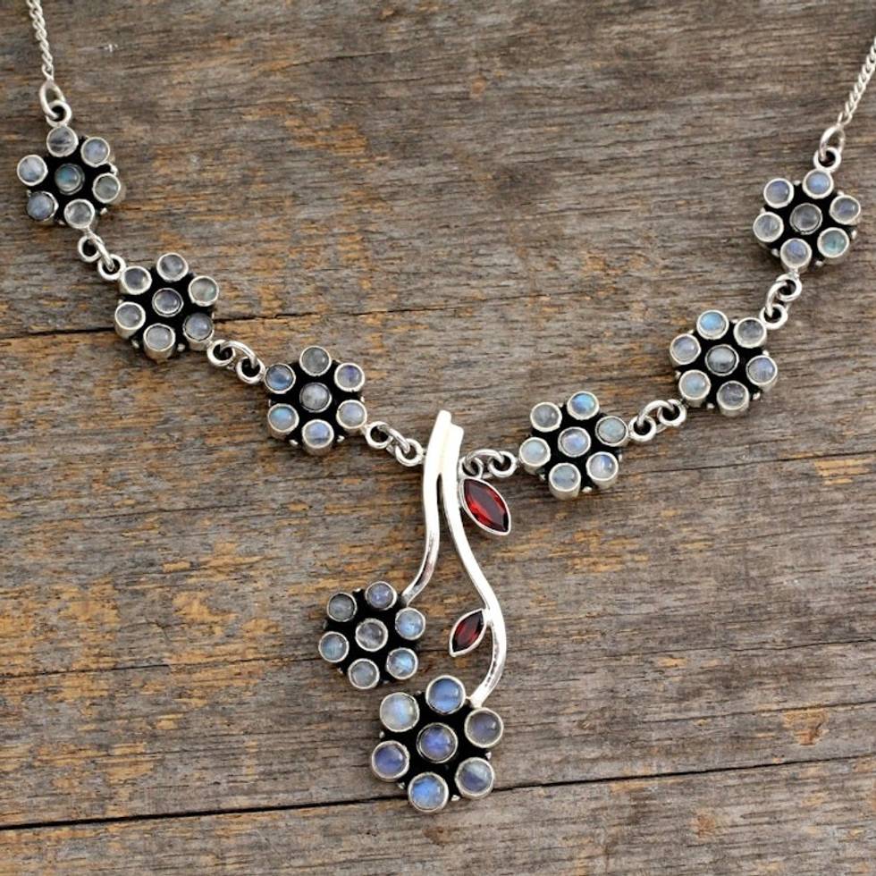 Moonstone and garnet floral necklace 'White Marigold' Item ID: 2671794460