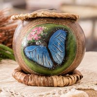 "Costa Rica's hopes flutter along the wings of this captivating morpho butterfly portrait, painted on a dried gourd by Ruth Mora. Capturing the graceful essence of the region's forest, the artisan reunites natural elements to create this decorative accent of exquisite taste. The piece is embellished with a lid made from natural fibers, conveying a message of love for nature."