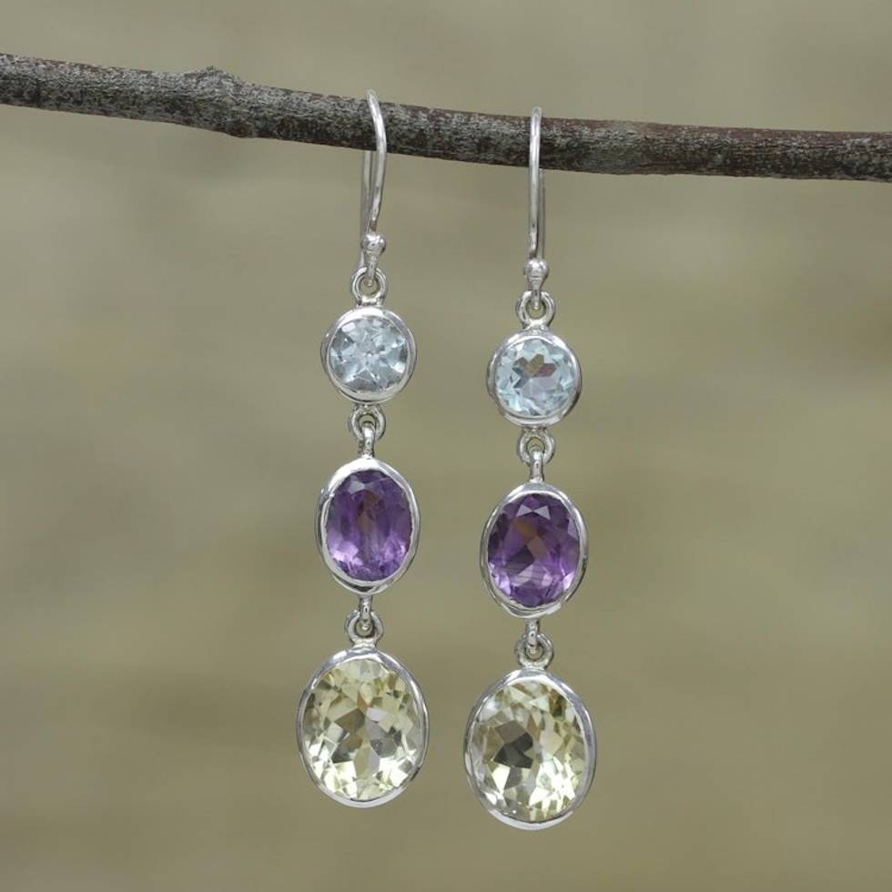 Multi-Gemstone and Silver Dangle Earrings from India 'Glittering Trio' Item ID: 2671620465
