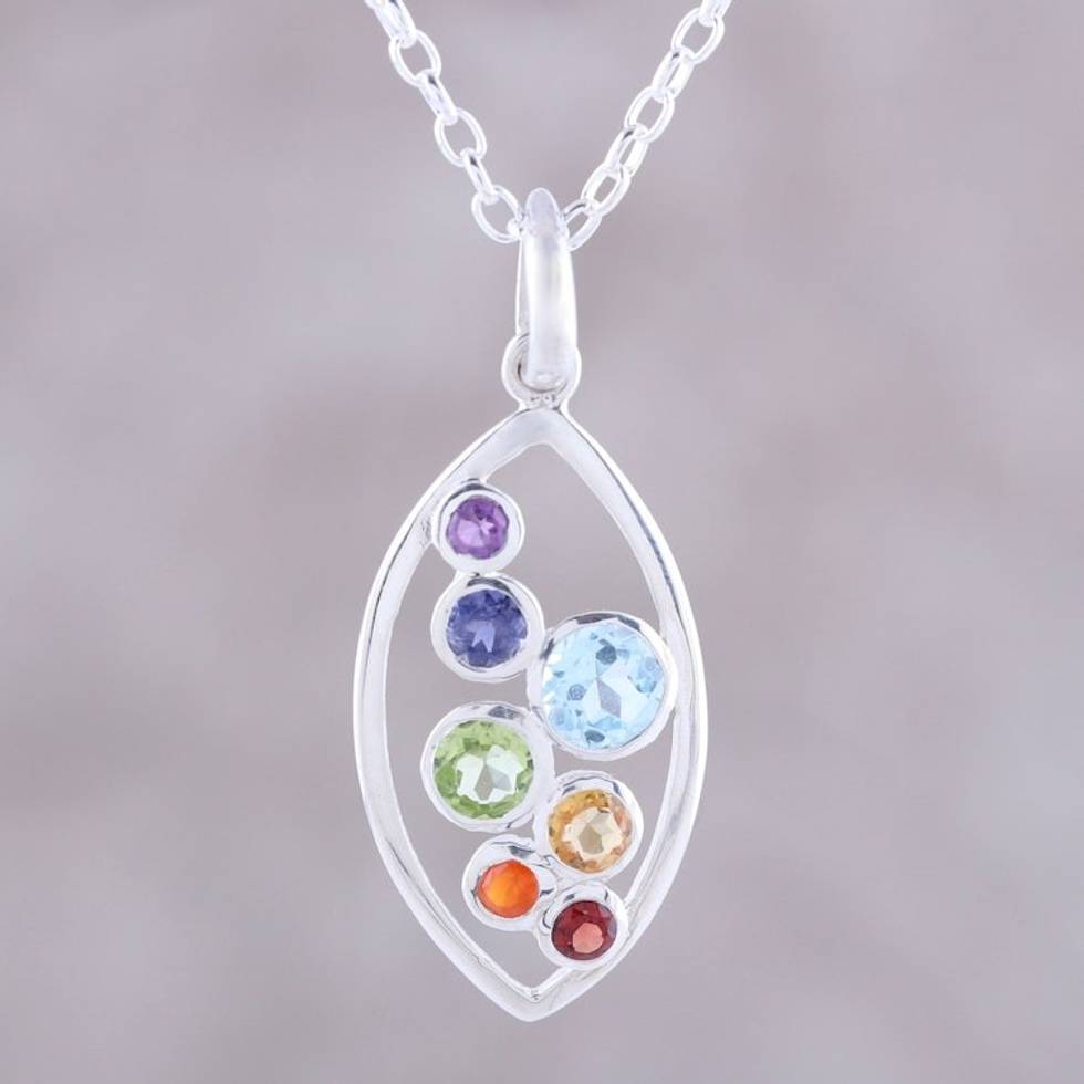 Multi-Gemstone and Sterling Silver Ellipse Pendant Necklace 'Rainbow Within' Item ID: 2671619187