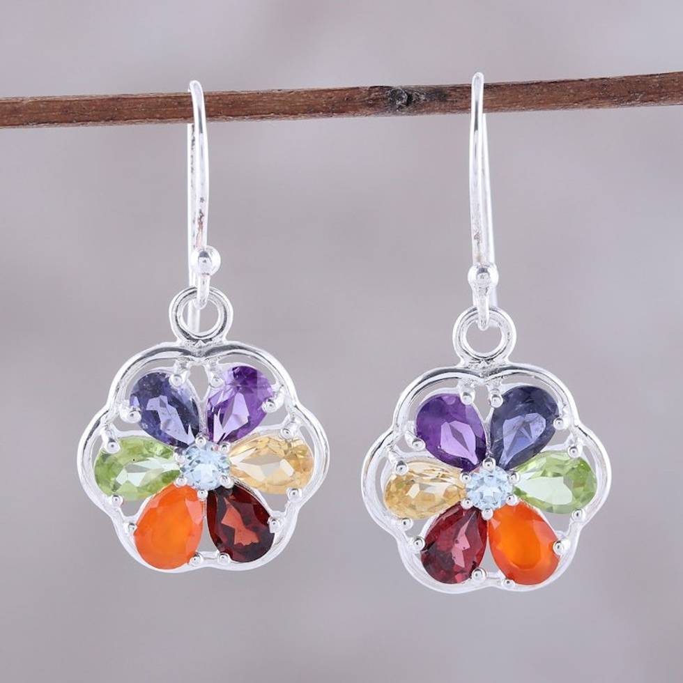 Multi-Gemstone Chakra Dangle Earrings from India 'Chakra Flowers' Item ID: 2671792594
